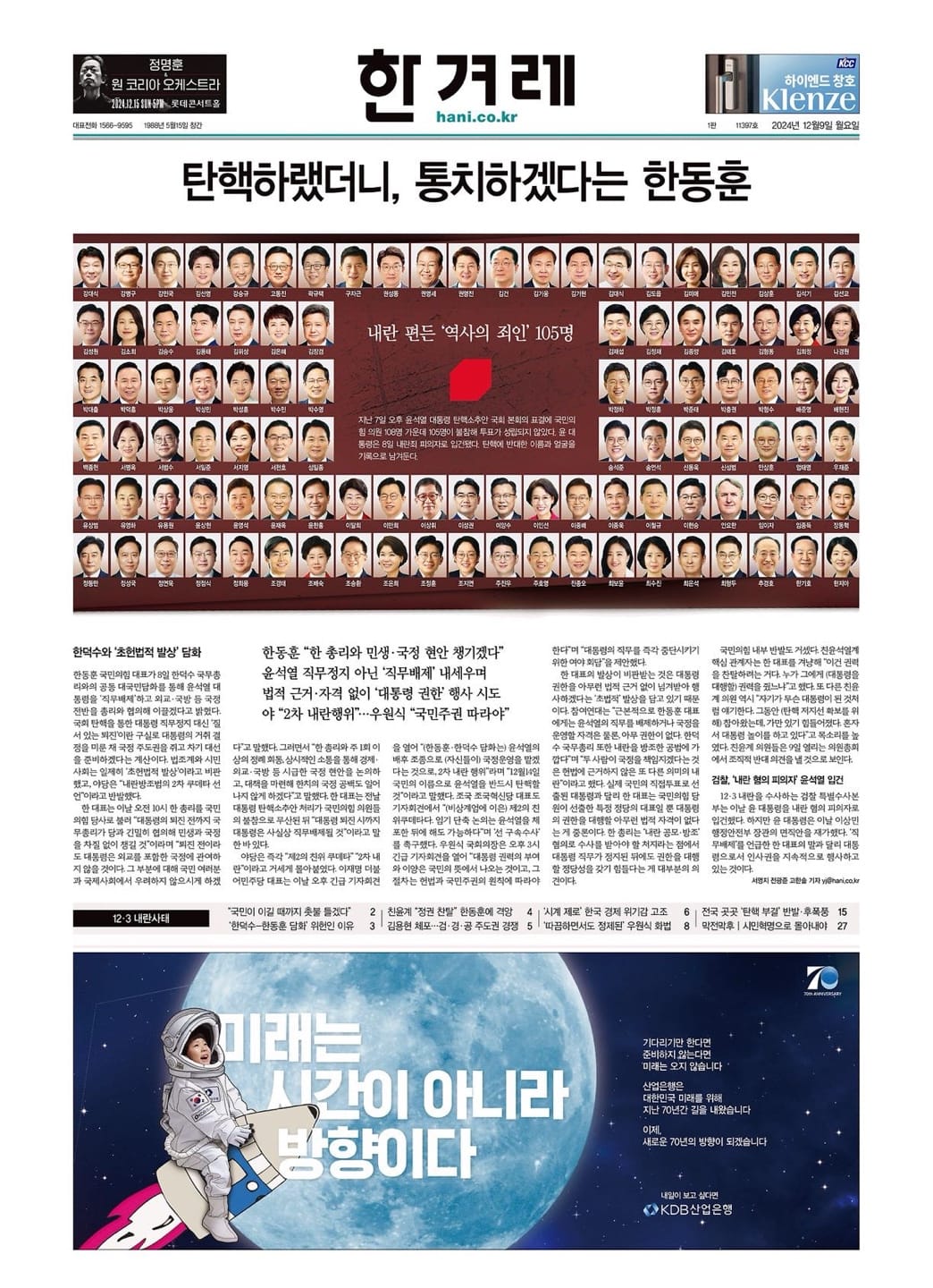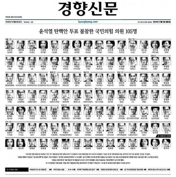 2024년 12월 9일자 한겨레와 경향신문은 1면에 탄핵 표결에 불참한 105명의 의원의 사진을 실었다.